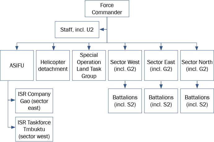 Concerning intelligence, the aforementioned Secretary-General report on UN Counterterrorism Strategy implementation (UNGA, 2016) listed the deployment of a military intelligence unit in MINUSMA to tackle terrorist groups operating in northern Mali: the All-Sources Information Fusion Unit (ASIFU) (Karlsrud, 2017). This unit is set to coordinate with each sector headquarters, which have their own intelligence staff. These tasks make MINUSMA the only UN peace mission with “organic military intelligence-gathering and processing capability” (Cherisey, 2017, p.1), emerged out of a push from European countries and with European personnel and material. ASIFU is functionally differentiated and a separate unit under direct authority of the commander (Rietjens & Baudet, 2017). ASIFU has its conceptual origins in the intelligence unit of Afghanistan’s NATO ISAF (Karlsrud, 2018), including capabilities as human intelligence operators, unmanned surveillance drones and attack helicopters, in addition to private contractors’ as well as open-source intelligence (ibid., 2018). Many of these capabilities drew “on Western experiences from counter-insurgency and counter-terrorism operations in Afghanistan and Iraq” (Karlsrud, 2017, p. 1220). See figure 2 for an organizational diagram of the mission.