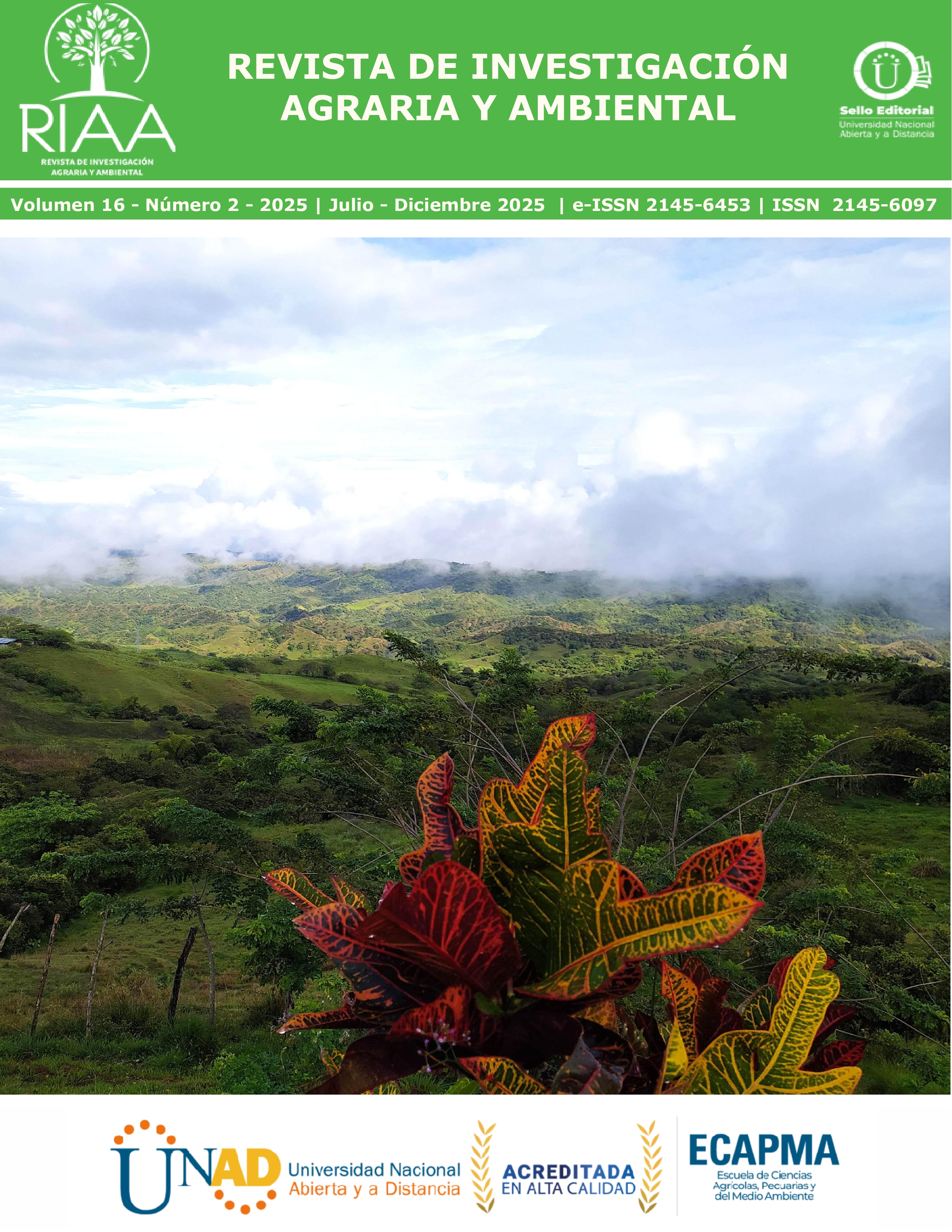 La Revista de Investigación Agraria y Ambiental (RIAA) es una publicación oficial de la Escuela de Ciencias Agrícolas, Pecuarias y del Medio Ambiente (ECAPMA) de la Universidad Nacional Abierta y a Distancia (UNAD), destinada a publicar artículos resultado de las investigaciones originales en el área Agraria, Ambiental y afines. Desde su inicio en el 2009, la RIAA se ha consolidado como un canal que incentiva la colaboración entre investigadores, a través de la divulgación y transferencia de conocimiento, demostrando su posicionamiento gracias a su indización en bases de datos nacionales e internacionales y a su compromiso con lo hoy conocido como la nueva sociedad del conocimiento.